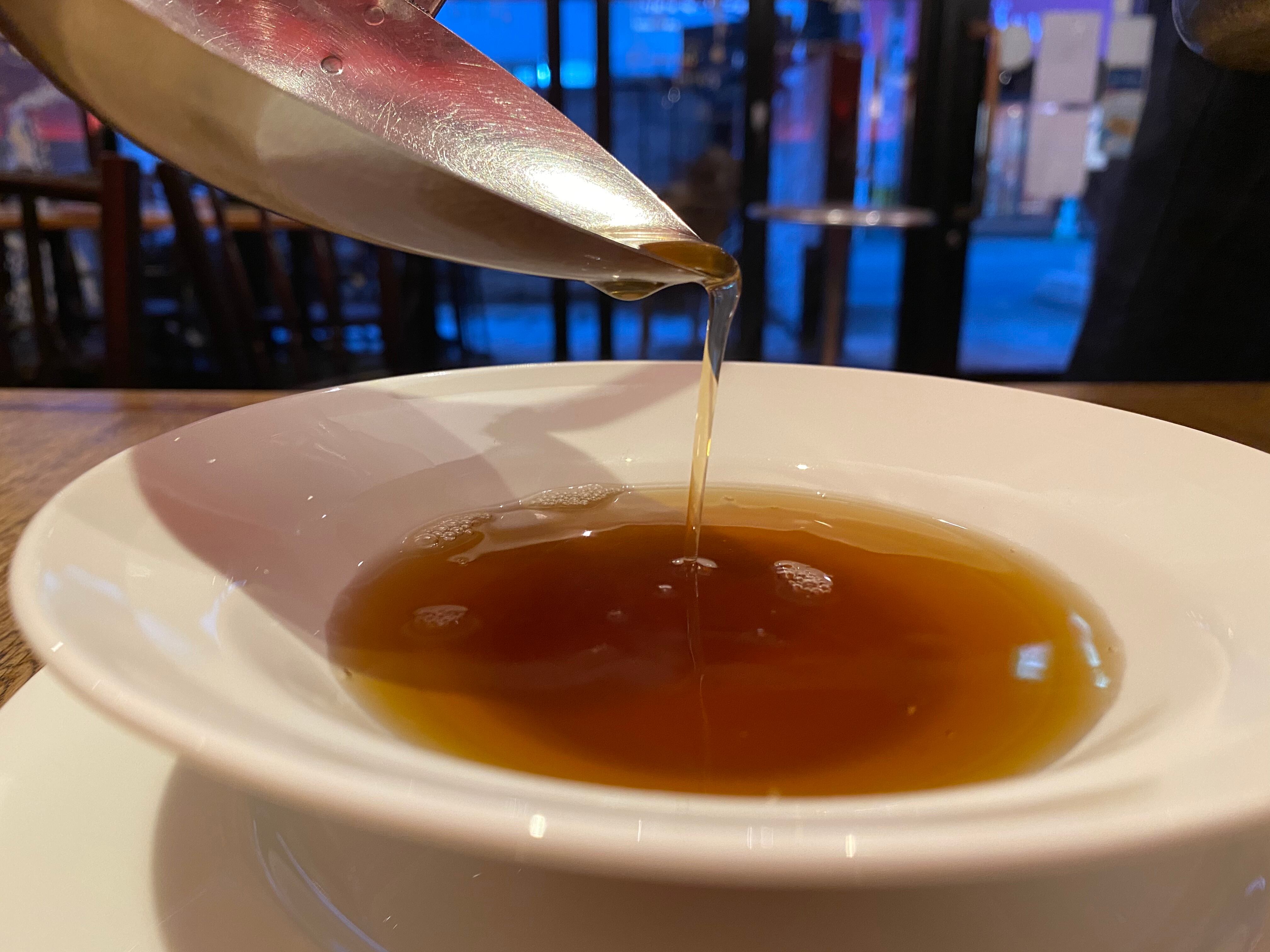 牛肉や鶏肉、香味野菜を長時間煮出して作ったお出汁をさらに卵白などを使って琥珀色に『澄まして』仕上げるフランス料理の代表的なスープです。