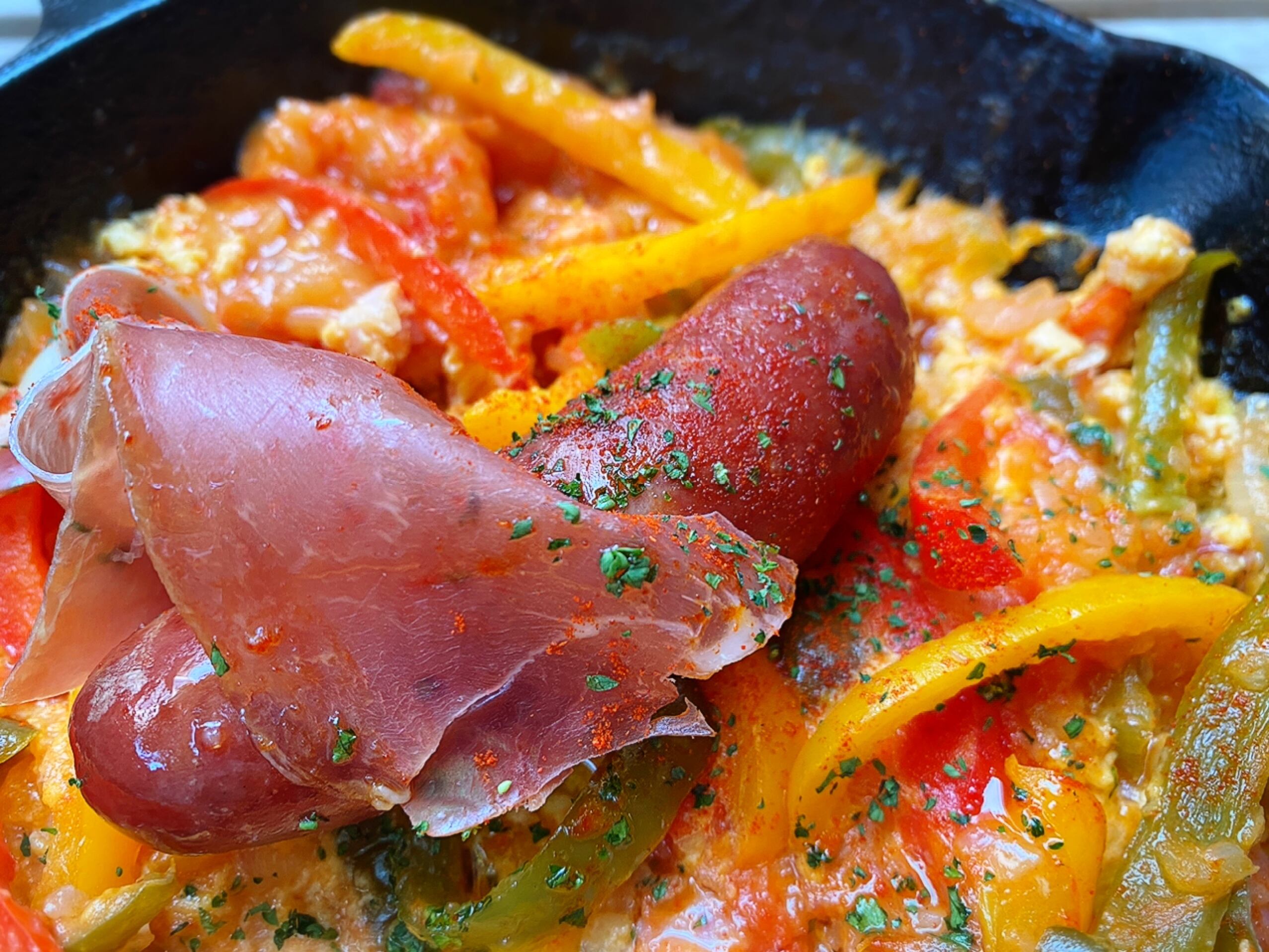 ピーマンやパプリカ、玉ねぎ、ニンニクなどを炒め合わせて唐辛子とトマトで煮込むバスク地方の郷土料理。