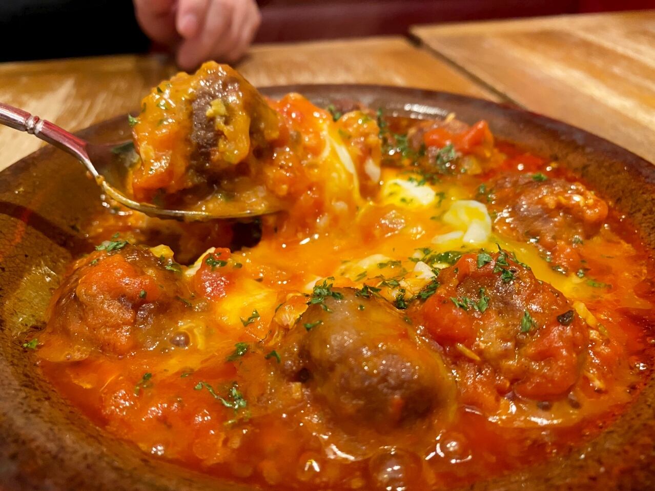 スパイスたっぷりのトマトソースで煮込んだミートボールに北アフリカ生まれの辛み調味料『アリッサ』を添えてお召し上がりいただきます✨