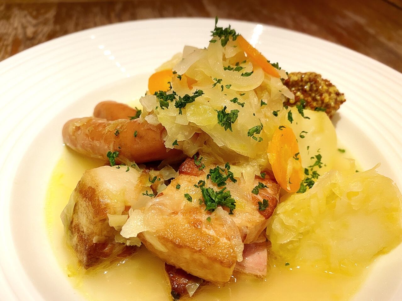 塩漬けキャベツとお野菜、豚肉、ベーコン、ソーセージを使ったアルザスの煮込み料理。