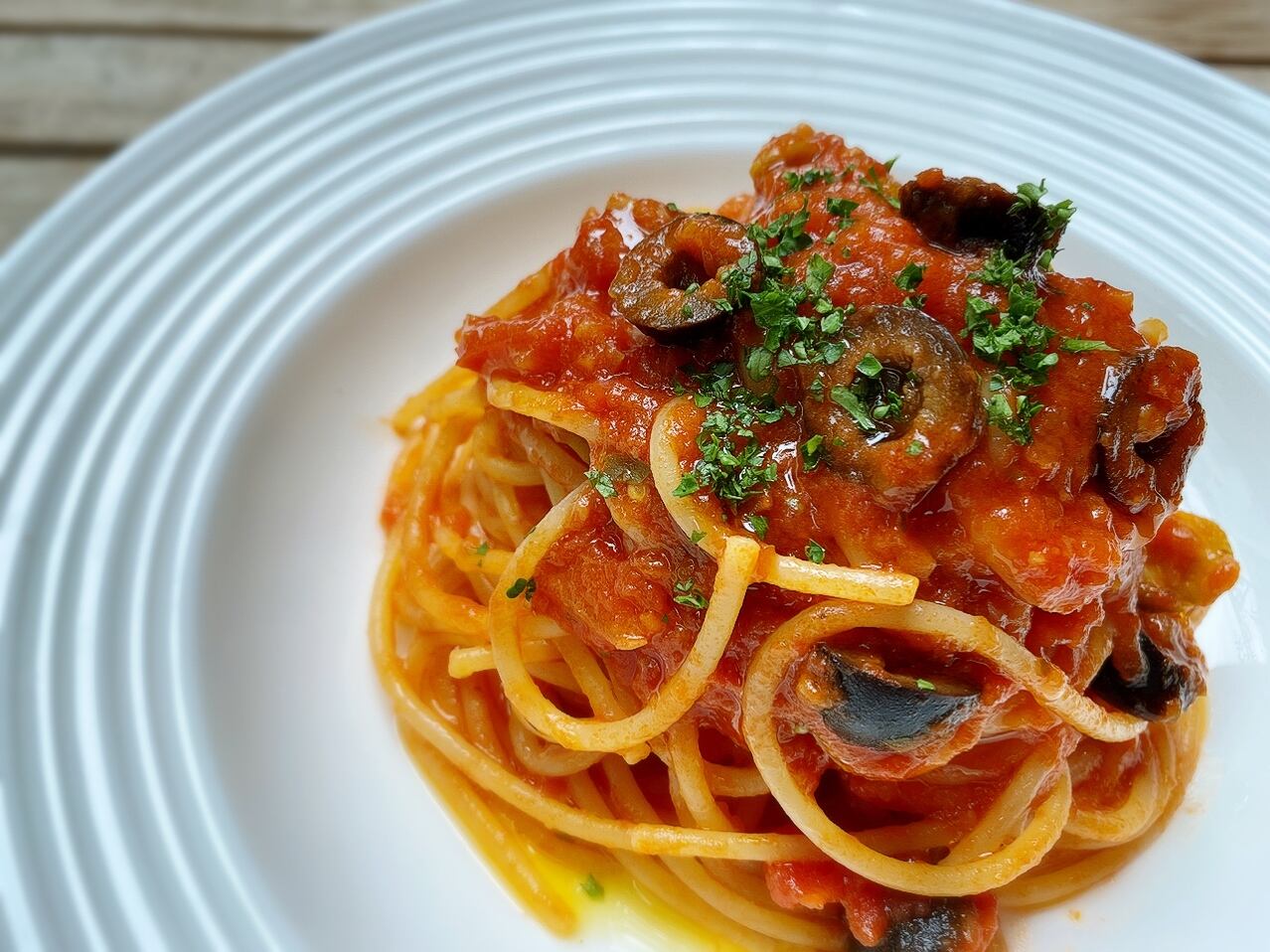 『プッタネスカ』=『娼婦風パスタ』。アンチョビやオリーブ、ケッパーの塩味やうま味、適度な酸味のバランスが美味しいパスタです♪