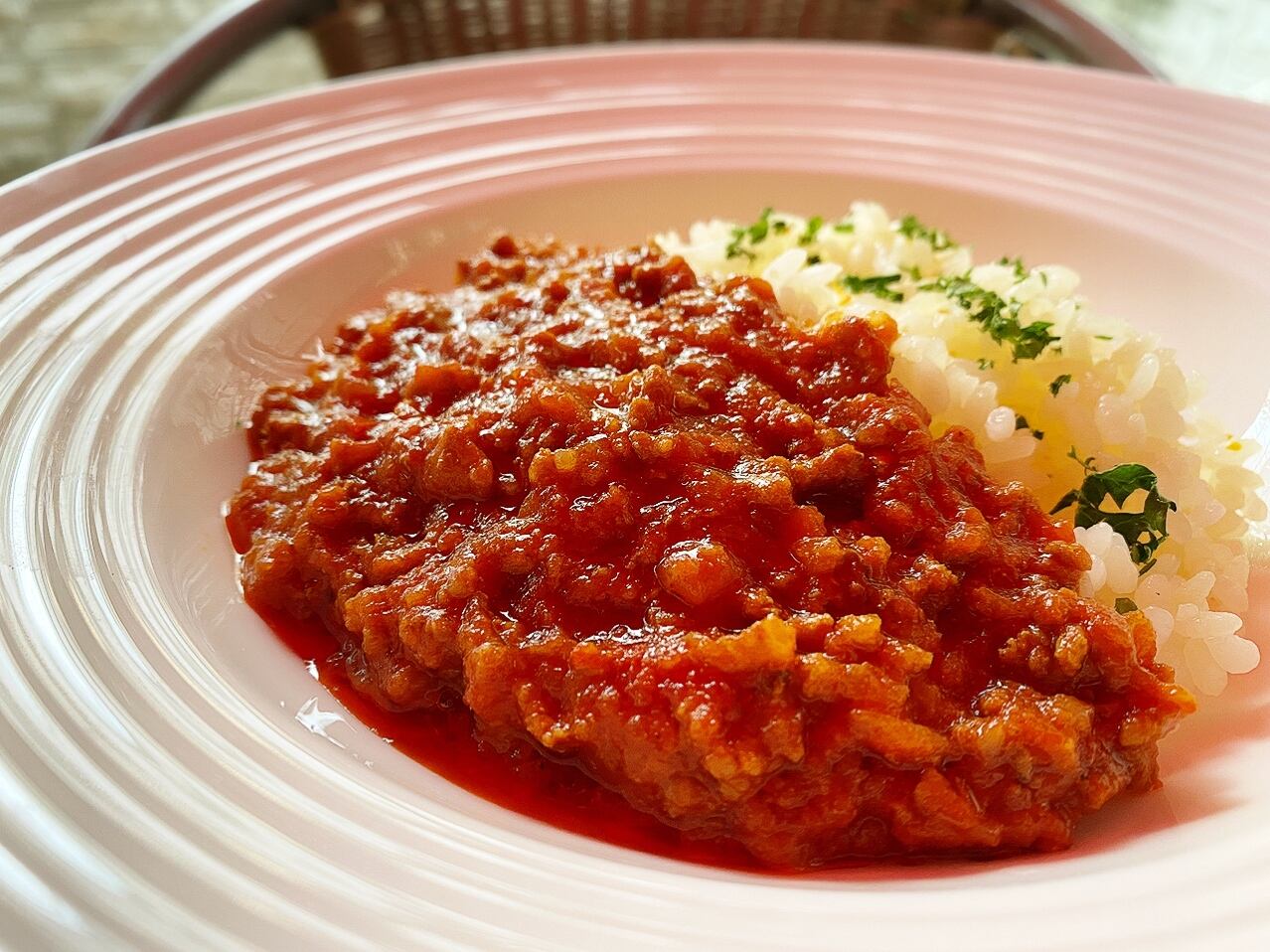 じっくり炒めた香味野菜の甘みとうま味、しっかり表面を焼き付けてから煮込んだ新鮮な挽肉の香ばしい風味とうま味、トマトの適度な酸味とうま味、そしてスパイス!