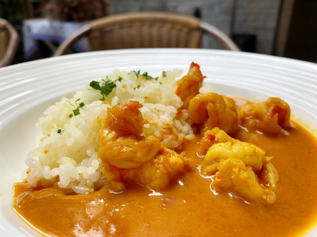 海老の殻から取ったうま味たっぷりのお出汁をベースに、飴色玉ねぎのうま味やコク、トマトの適度な酸味、ココナッツミルクのまろやかさ、そしてスパイスの風味が加わった絶品カレーです♪