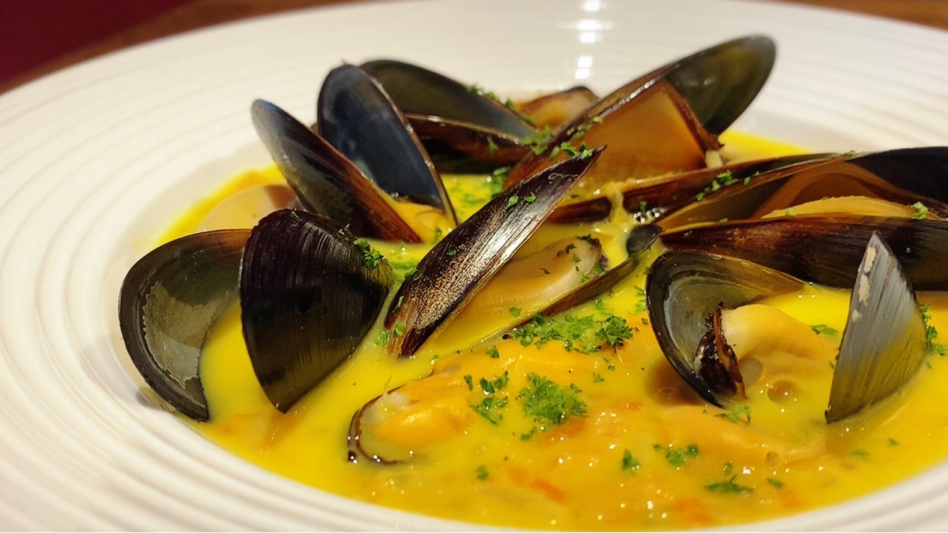 ムール貝のうま味と弱火でじっくり炒めた香味野菜の甘みとうま味、トマトの酸味、カレーのスパイシーな風味、そして生クリームのクリーミーさとバターのコクが渾然一体となった美味しいスープです。