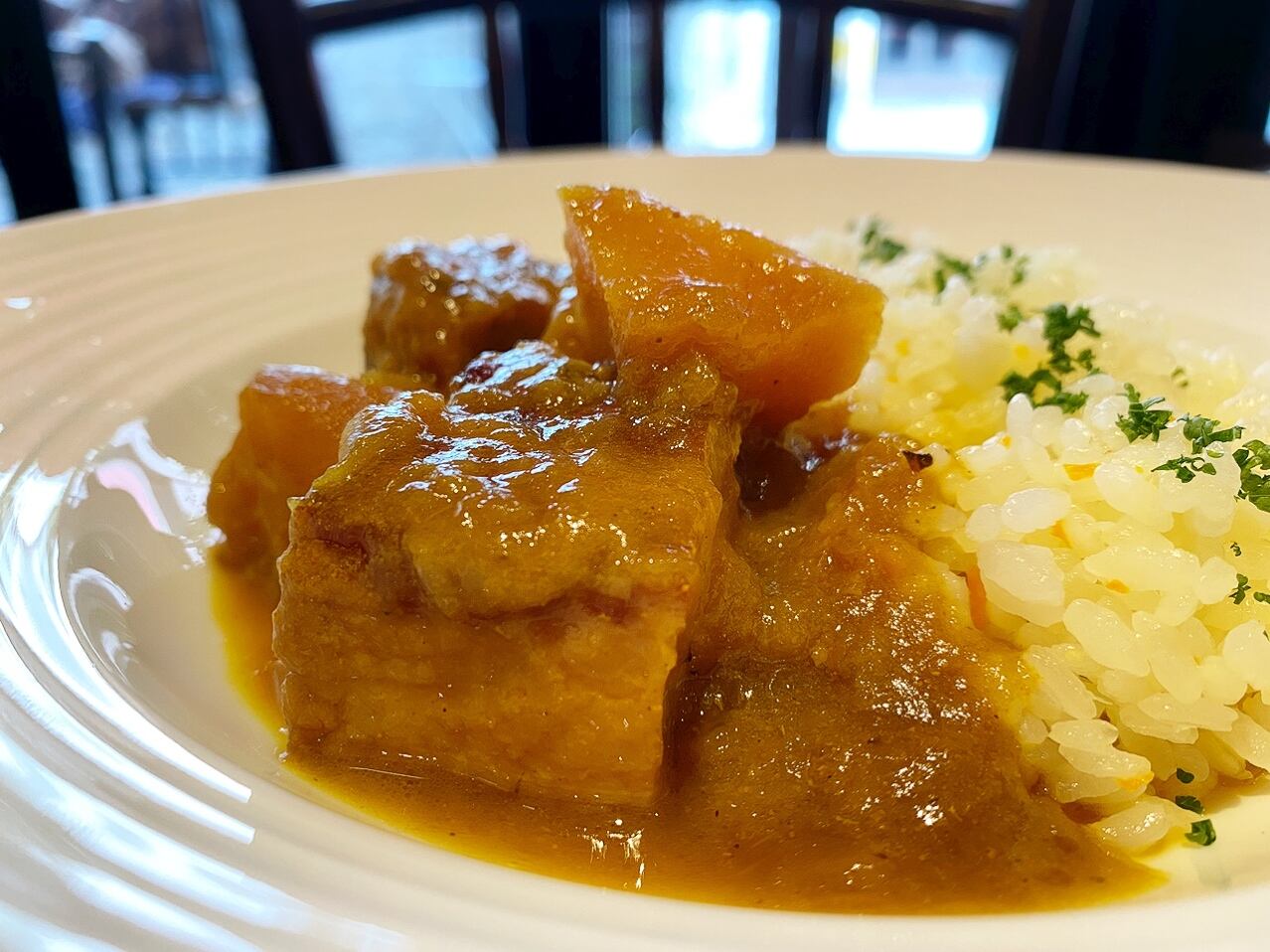 相性の良い豚バラ肉と林檎を林檎のお酒『シードル』と一緒に煮込んだカレーです。