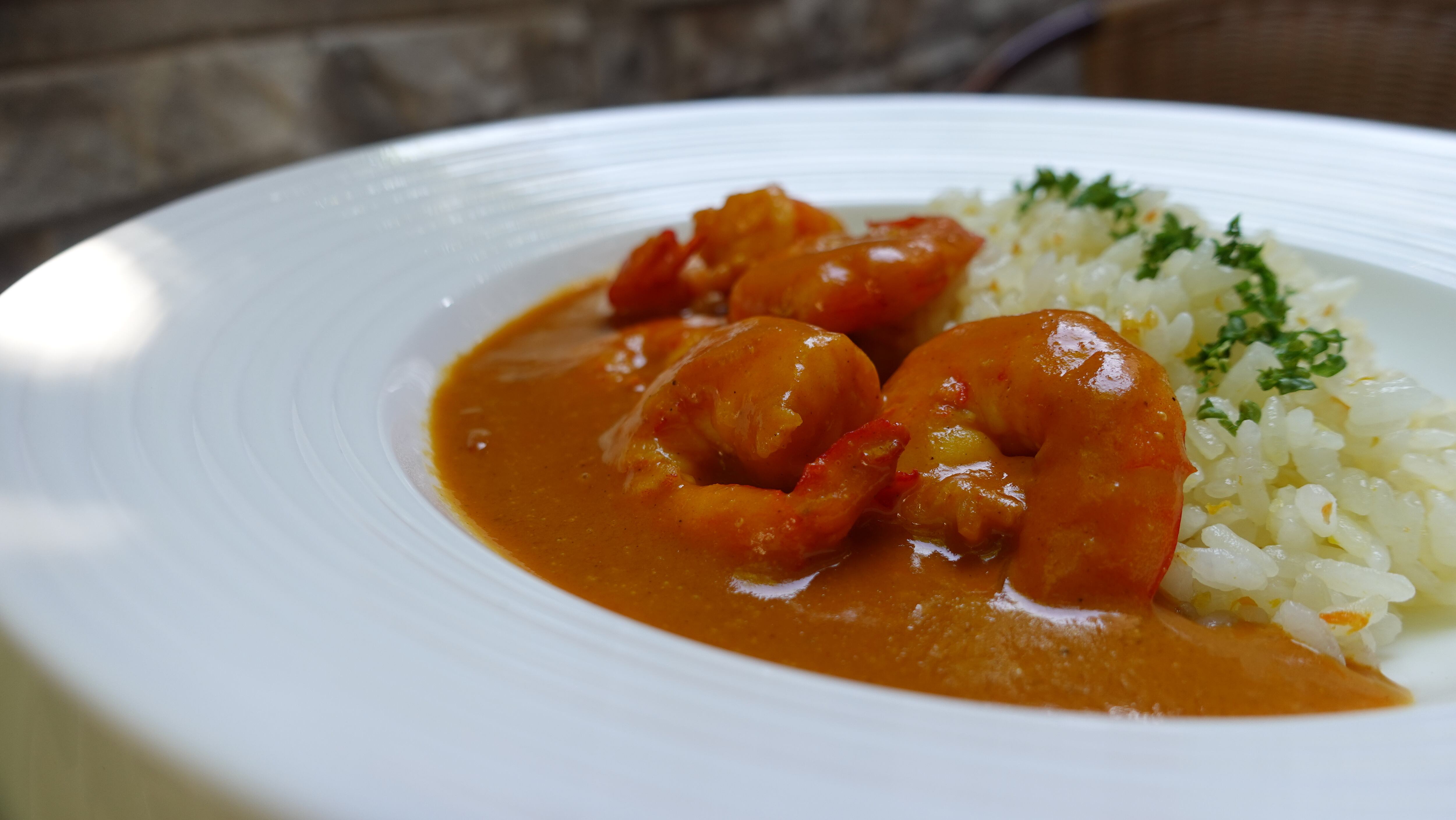 甘みを引き出すように炒めた玉ねぎと、煮詰めて味を凝縮させたココナッツミルク、焼いた海老の殻から煮出したお出汁を使ってうま味たっぷりに仕上げました。