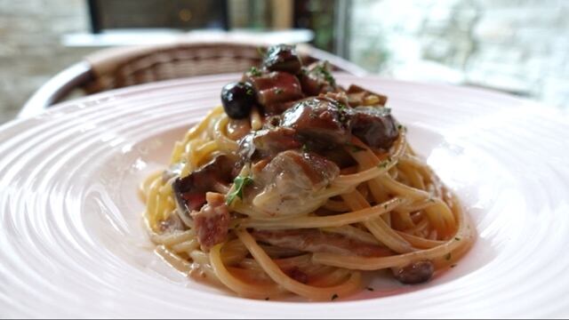 ポルチーニ茸の風味とうま味をプラスした鶏のお出汁に生クリームとソテーしたキノコを加え、香り高くうま味たっぷりに仕上げました。
