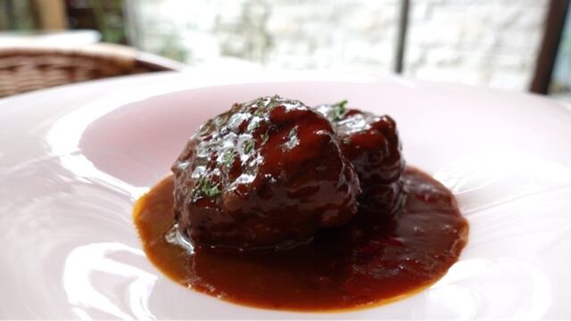 しっかりと表面を焼き固めてうま味を閉じ込めたハンバーグをオーブンでふっくらと火を入れ、さらに特製のデミグラスソースで煮込んで仕上げました。
