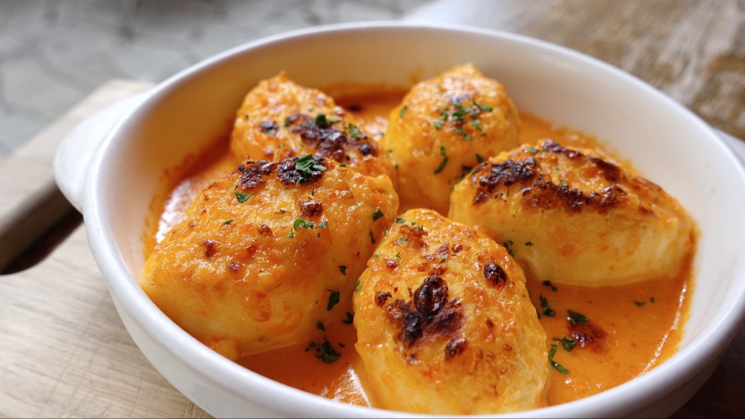 白身魚や海老で作ったすり身のだんごである「クネル」に、魚介の風味豊かなソースをかけてオーブンで焼き目を付けて仕上げるフランスのリヨン発祥のお料理です。