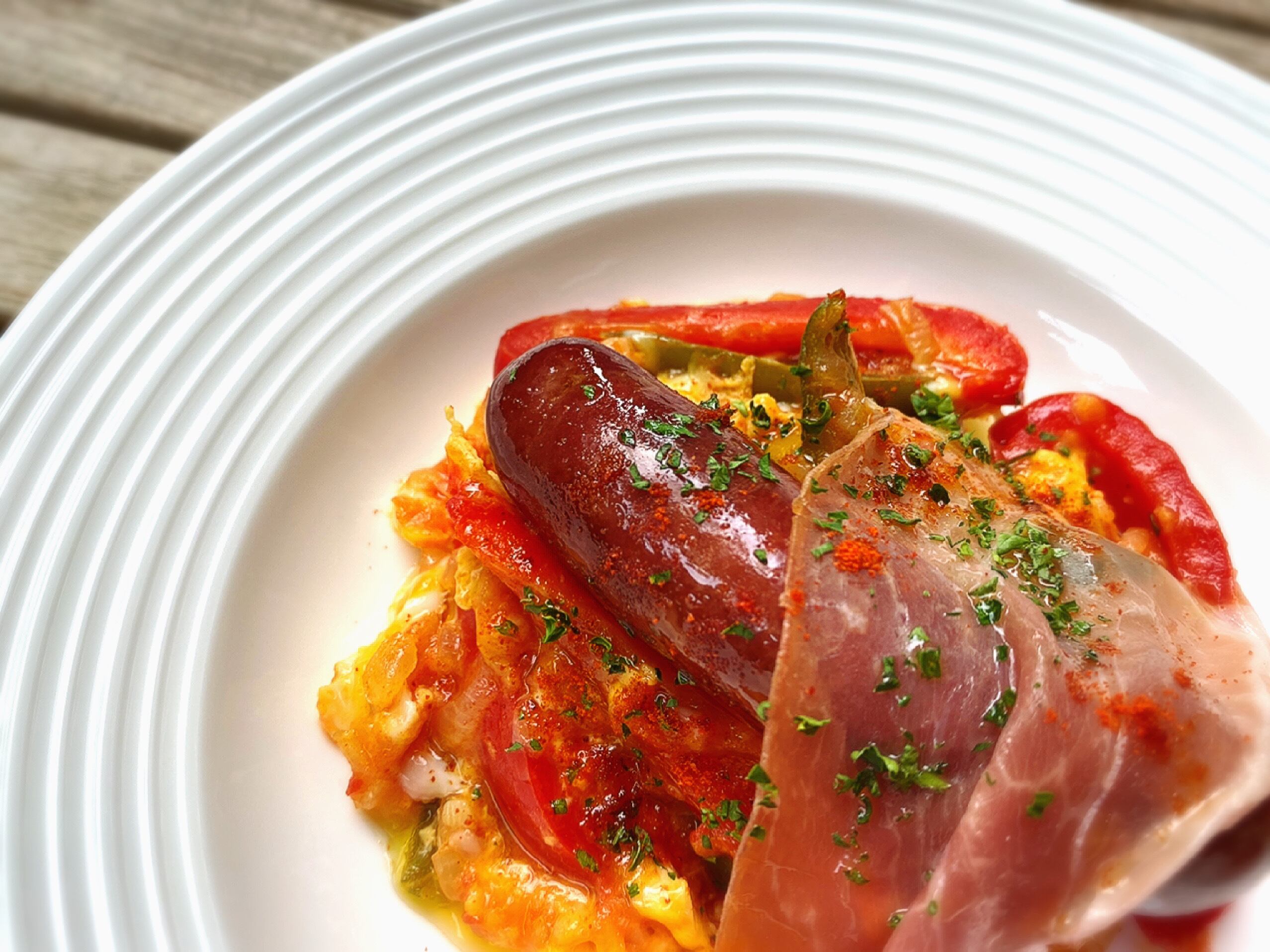 ピーマンやパプリカ、玉ねぎ、ニンニクなどを炒め合わせて唐辛子とトマトで煮込むバスク地方の郷土料理。