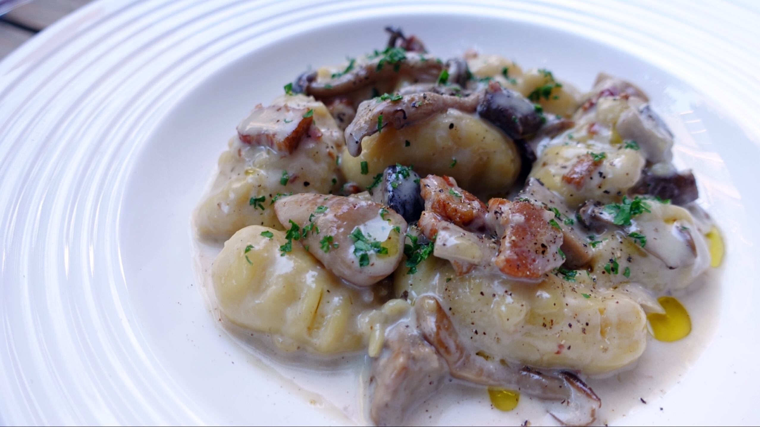 ① 調理済みメニュー『さつまいものニョッキ、キノコとベーコンのクリームソース』
