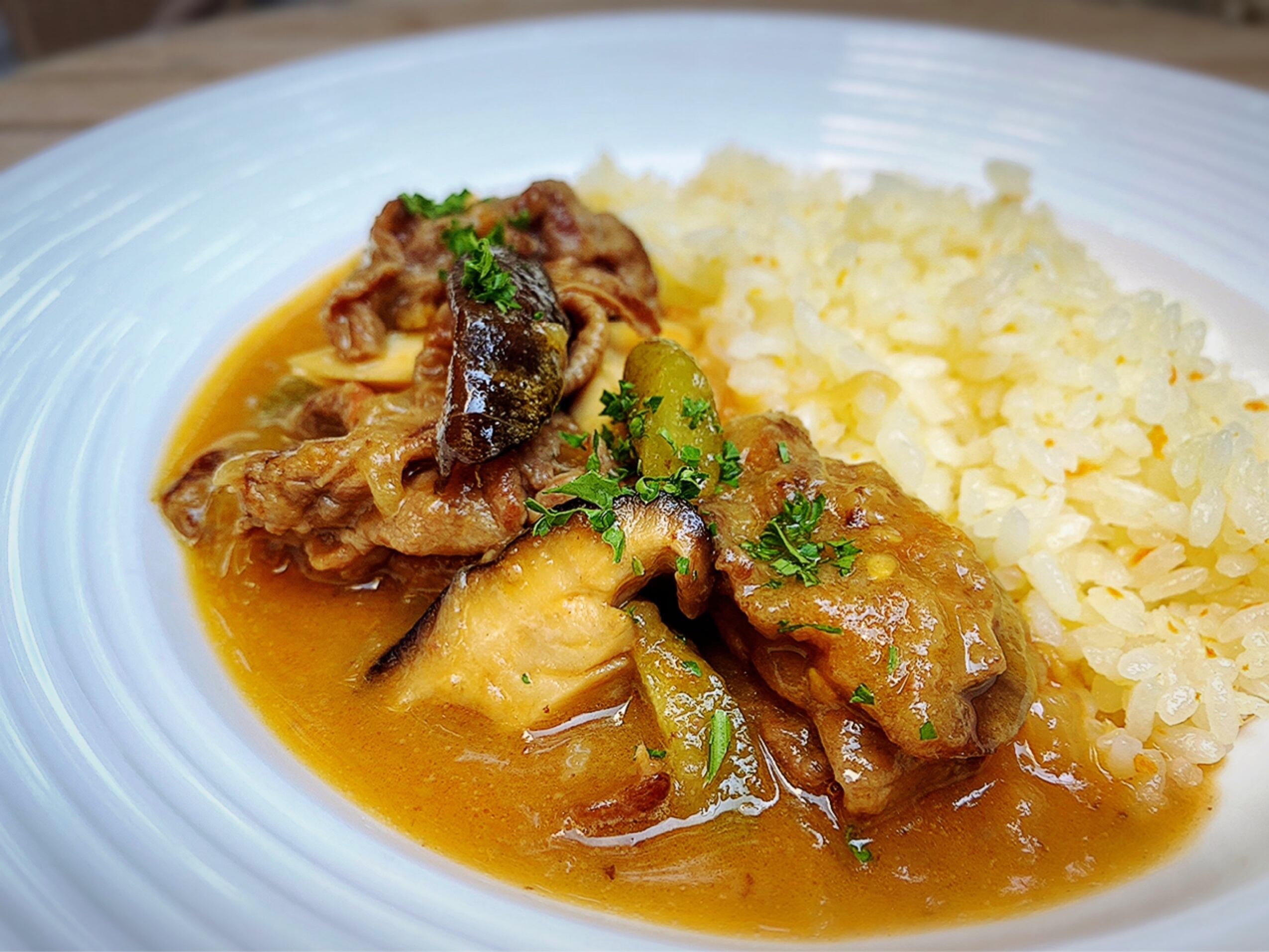 牛薄切り肉と飴色玉ねぎのうま味たっぷり、そしてトマトやコルニッションの酸味も心地良いシチュー仕立てのお料理です♪