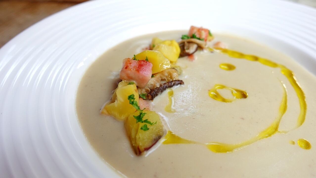 栗の優しい甘みにベーコンのうま味とキノコのお出汁のうま味と風味を合わせ、口当たりなめらかなヴルーテに仕上げます。