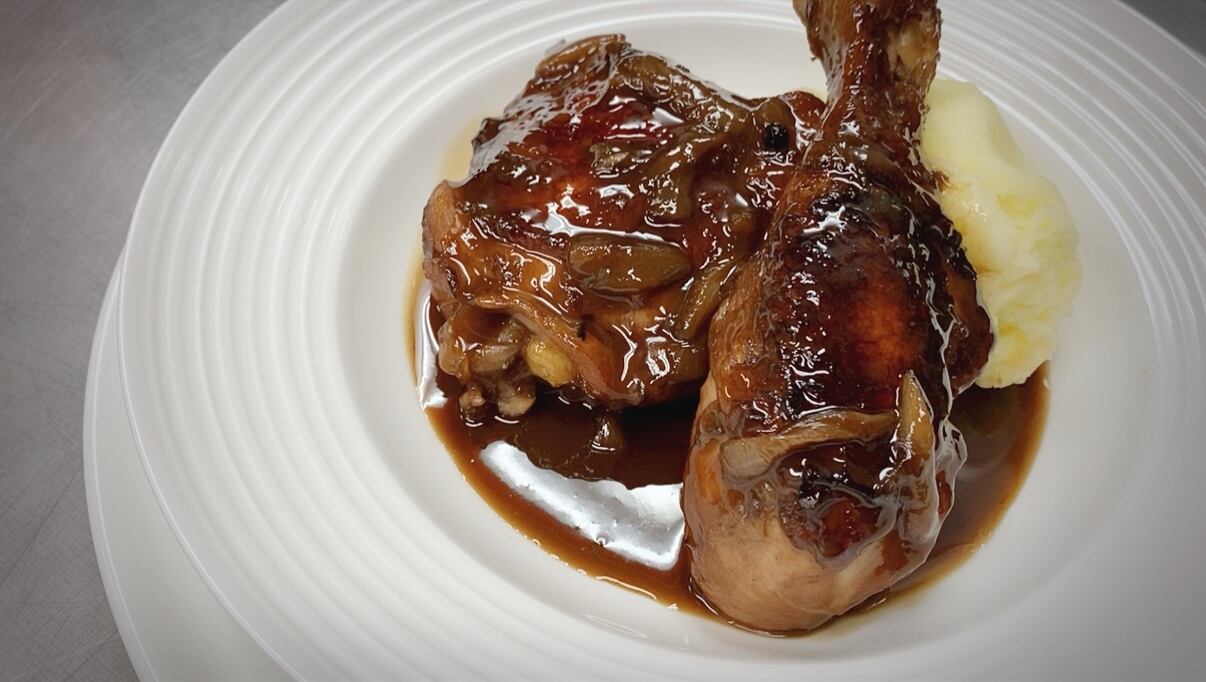 ブルゴーニュ地方発祥のお料理で、皮目を香ばしく焼き上げた骨付きの鶏モモ肉を香味野菜と共に赤ワインとフォン・ド・ヴォーで煮込みます。