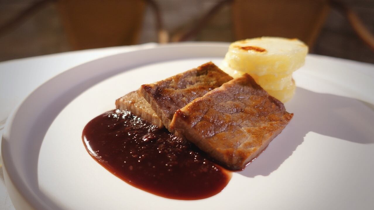 1.新作『牛肉のステーキ、赤ワインソースとグラタン・ドフィノア』(A5ランク黒毛和牛のサーロイン)