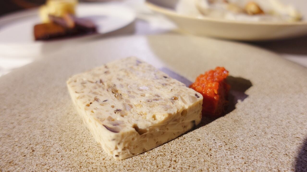 なめらかな帆立と鶏のムースにうま味を凝縮させたキノコのデュクセルをたっぷりと練り込み、オーブンで蒸し焼きにして仕上げたテリーヌです。