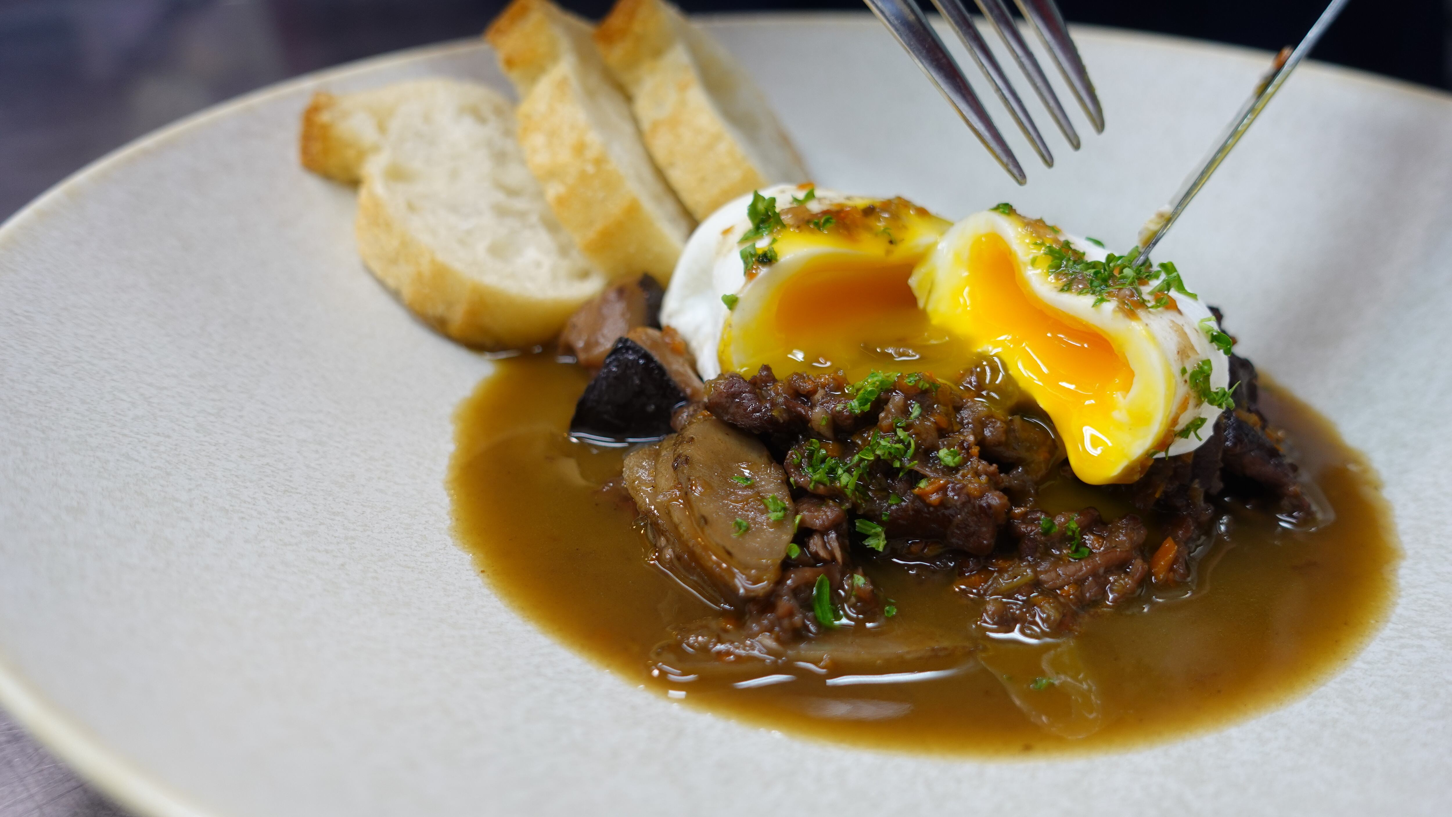 ポーチドエッグに赤ワインソースを合わせたフランスのブルゴーニュ地方の郷土料理。このレッスンでは相性のいい牛肉とゴボウを合わせて主役級に仕上げます。バゲット&ワイン必須の1品です♪