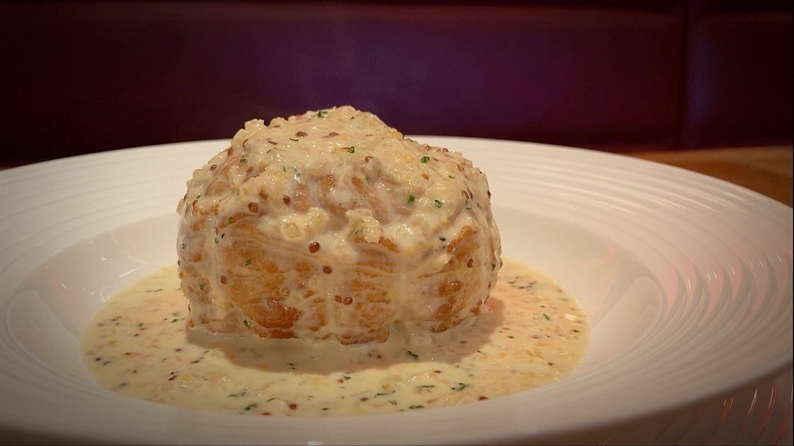 肉ダネを薄切り肉で包んで凧糸で巻き、表面を香ばしく焼き固めてから軽く煮込んで仕上げます。肉ダネにはキノコのデュクセルも練り込み、優しくもうま味たっぷりな1品です。マスタードクリームソースとの相性も抜群♪