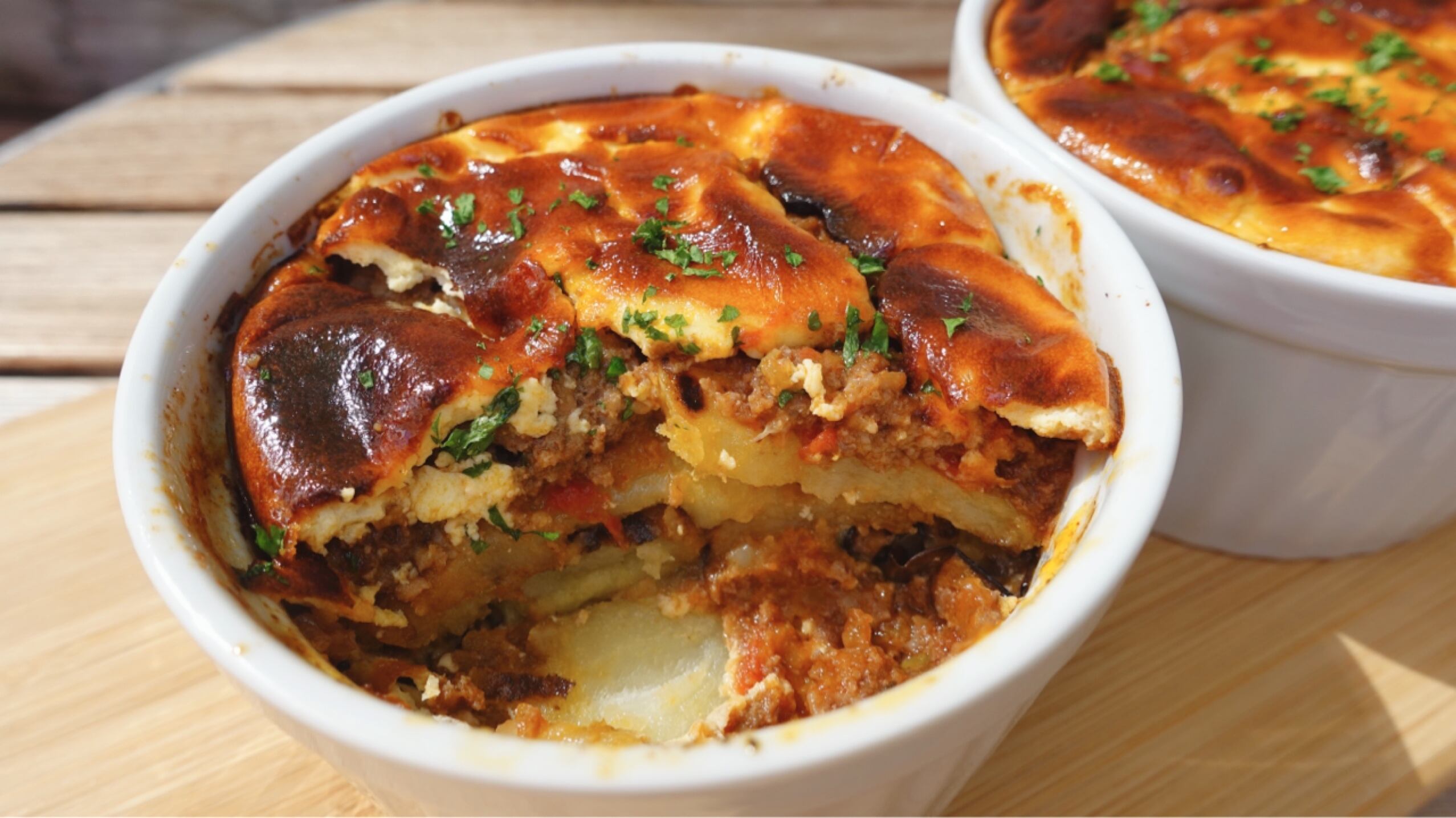 うま味たっぷりでスパイシーなミートソースとソテーした茄子やジャガイモ、そしてヨーグルトソースを層にしてオーブンで焼き上げます。