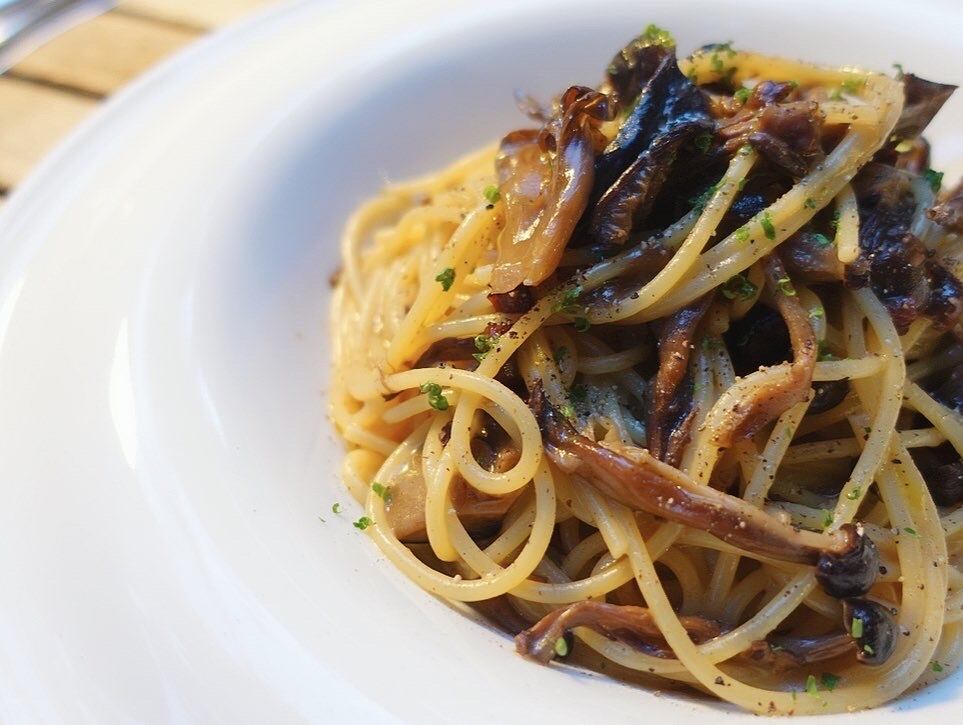 乾燥させてうま味と風味を凝縮させたたっぷりのキノコを、じっくり炒めた玉ねぎや鶏のお出汁、そして少量の生クリームと合わせて仕上げたパスタソース。優しくも香り高く、うま味もたっぷりです♪