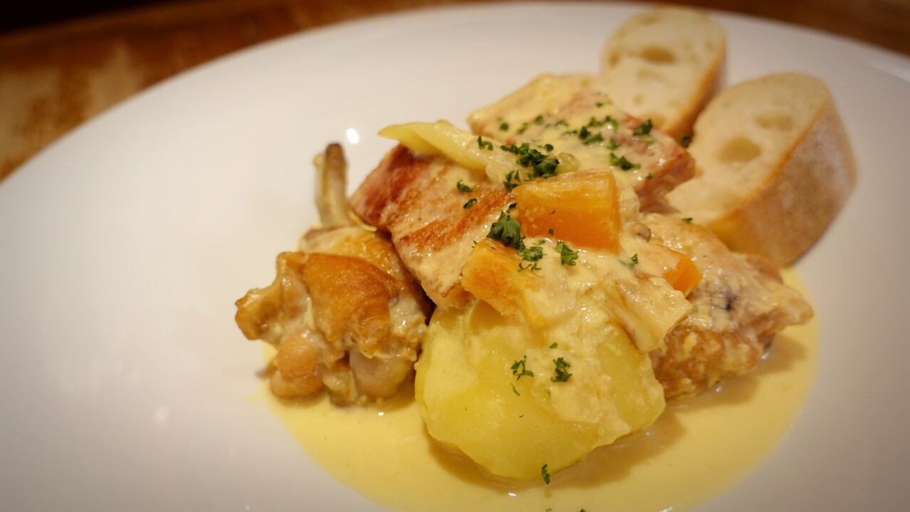 ベルギーやベルギーと国境を接するフランスのフランドル地方の郷土料理で、日本でいうところの『クリームシチュー』のような1品です。鶏肉を香味野菜と共に煮込み、そのうま味たっぷりの煮汁にクリームや卵黄を加えて優しくもリッチに仕上げます。ほんのり酸味もあってクセになる味わいです。